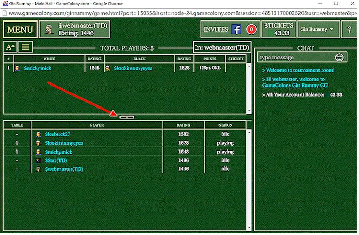 Tournament room (see gin-rummy room example below - same for dominoes) now has resizable upper and lower areas for tables/players.
